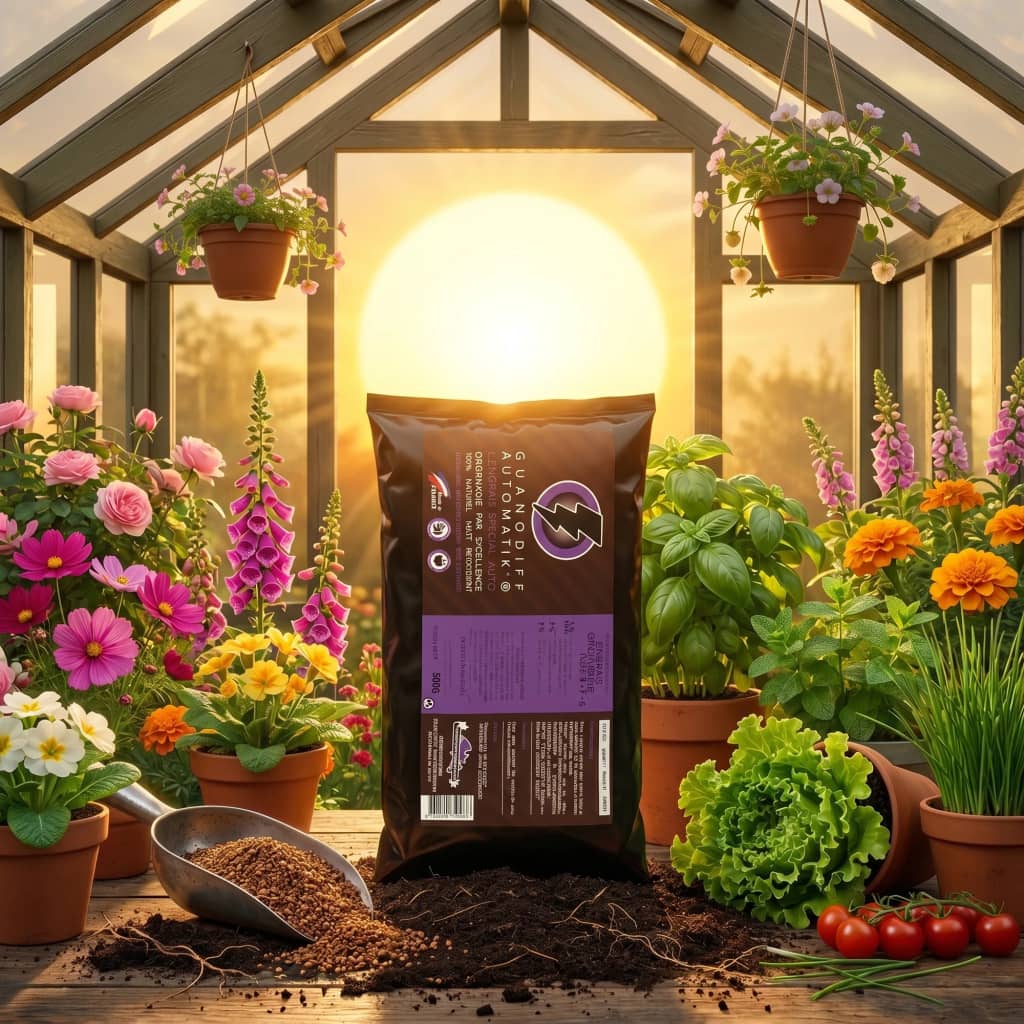 Guanodiff Automatik est optimisé pour les cultures à cycle court : plantes autoflorifères, potager rapide, fraisiers remontants, tomates précoces, aromatiques annuelles. Son profil riche en phosphore le rend particulièrement adapté aux phases de floraison et fructification. L'application est conçue pour la terre et les pré-mix enrichis, sans compatibilité avec l'hydroponie recirculante stricte.